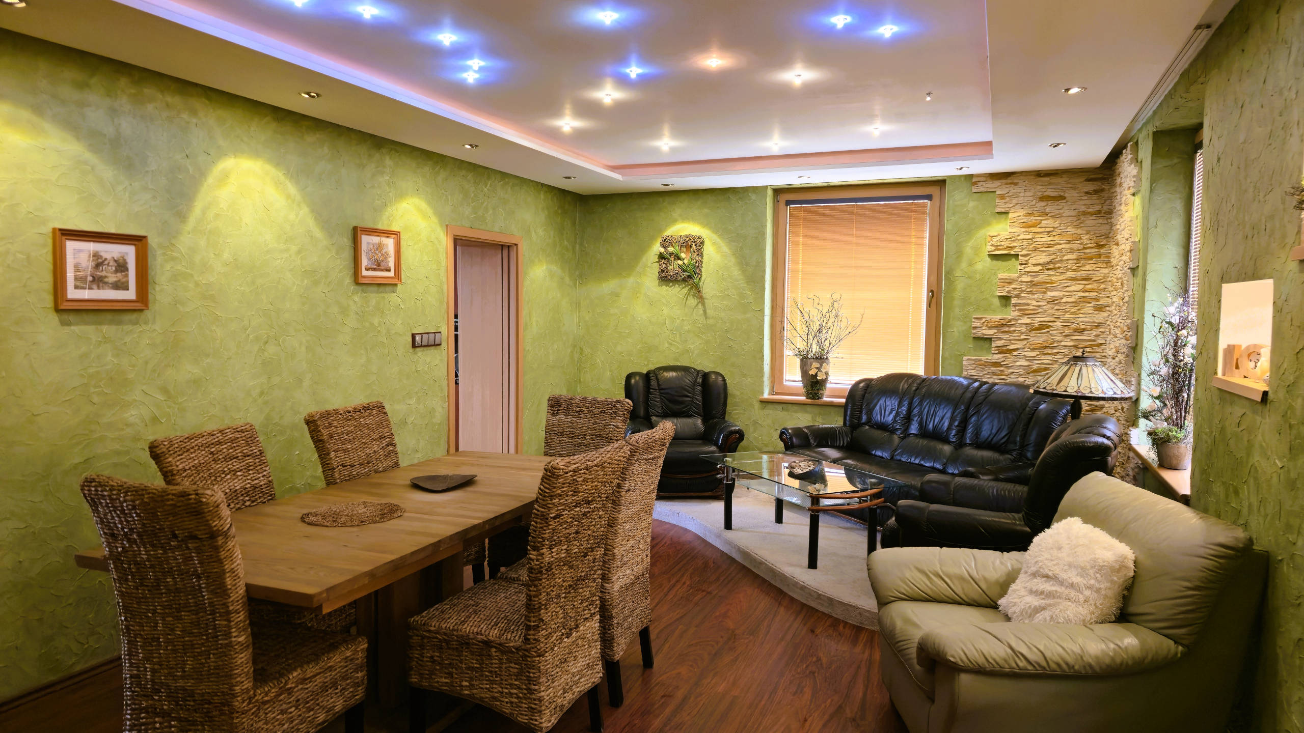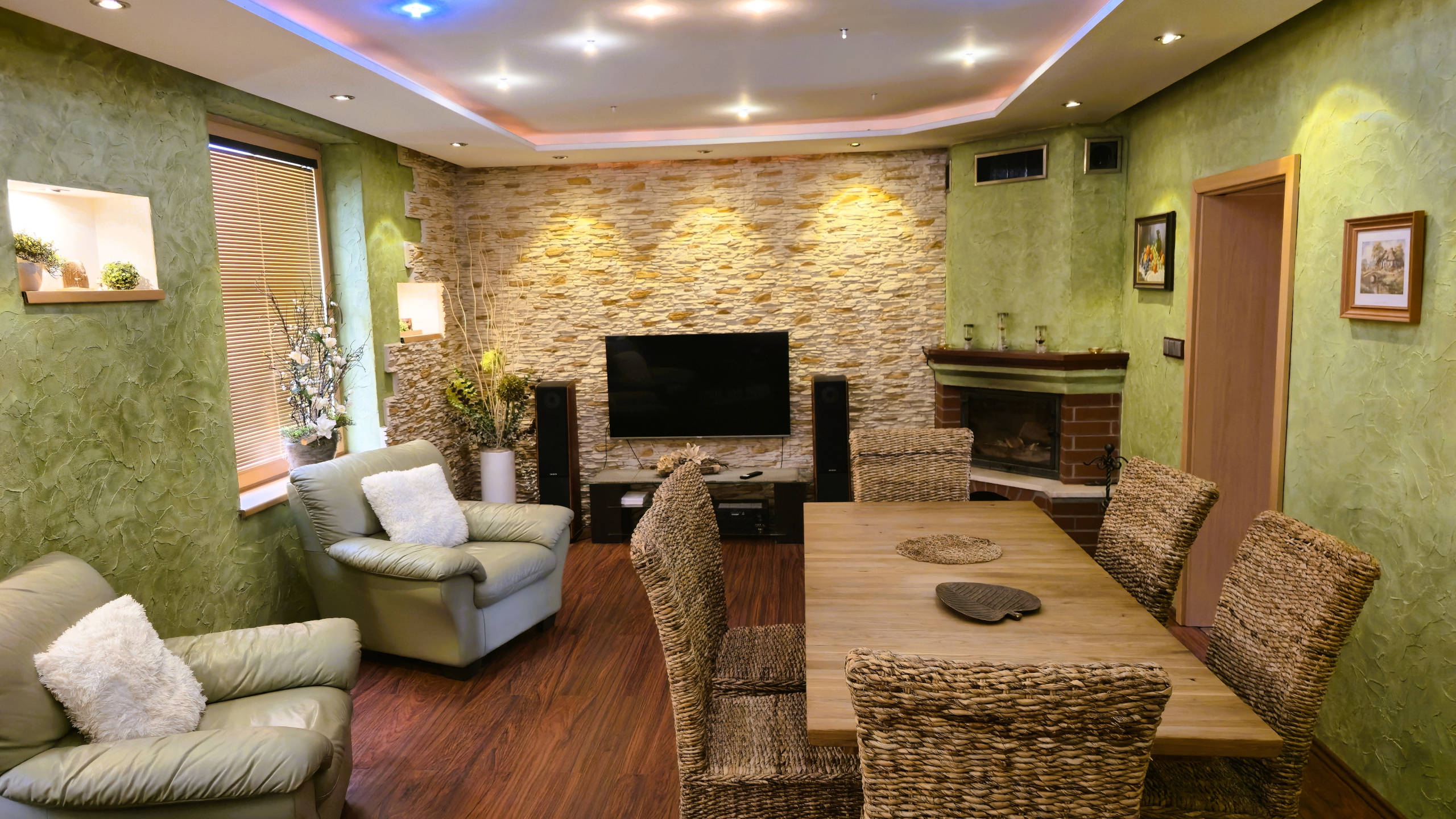 Přízemní patro vily nabízí útulný obývací pokoj s komfortní odpočinkovou zónou, velkým jídelním stolem, televizí se soundsystémem a plně vybavenou kuchyní. Je zde k dispozici také toaleta.