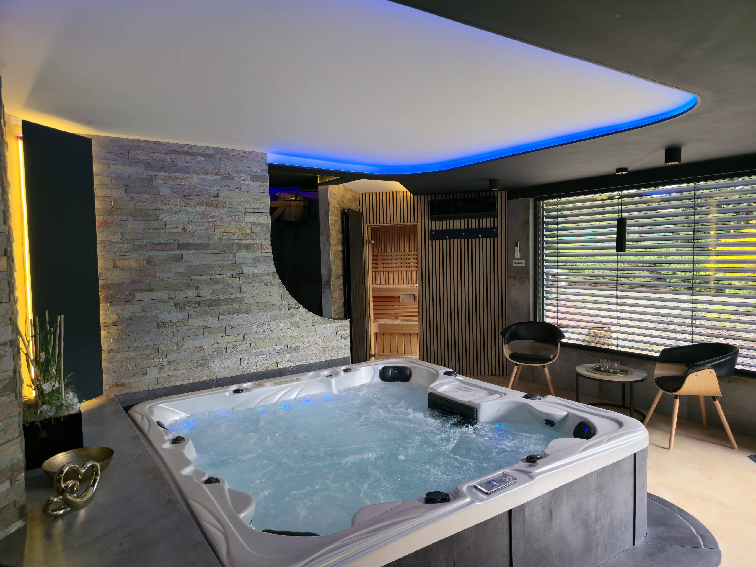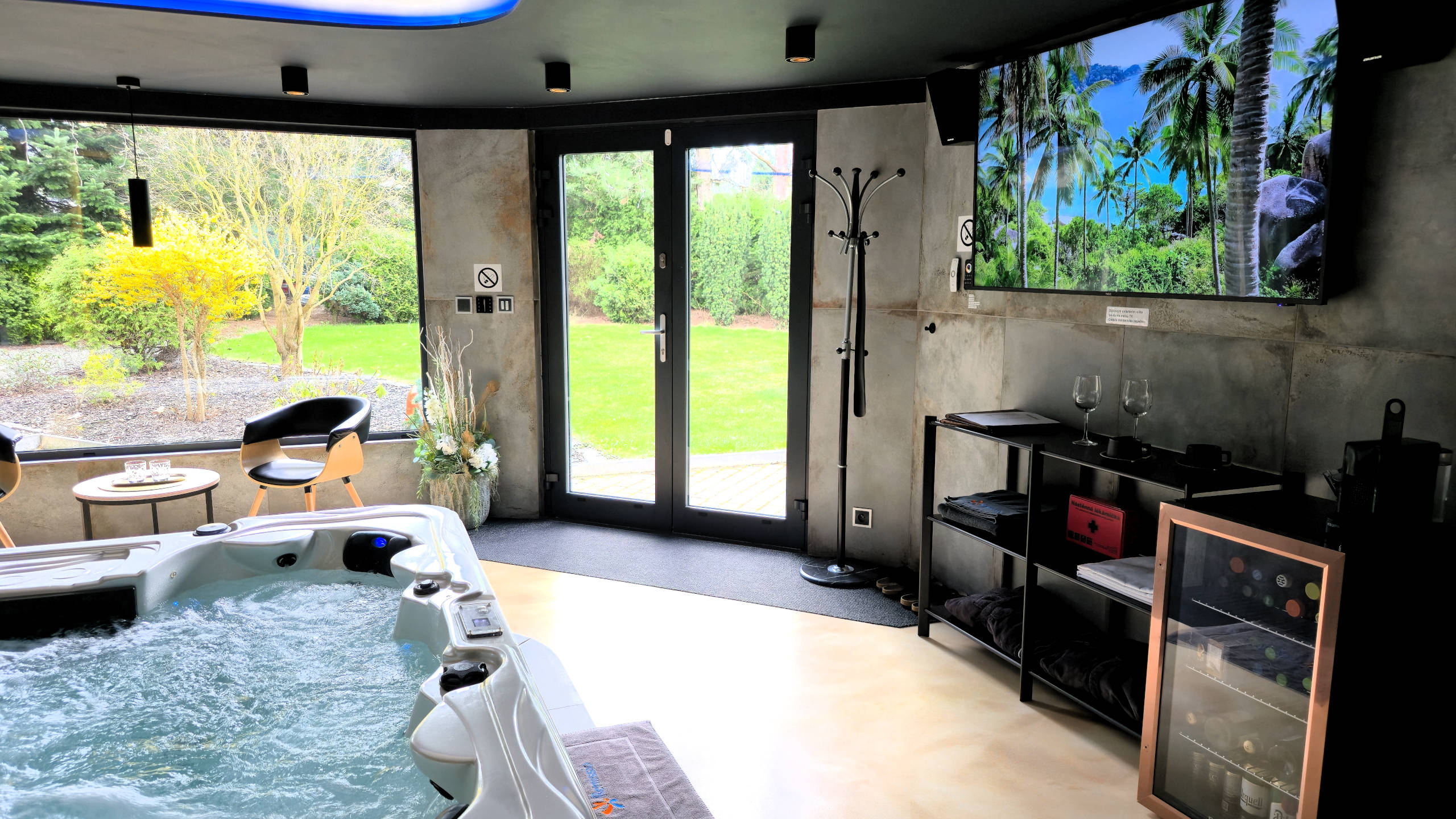 Zahradní wellness obsahuje saunu, ve které si sami topíte, vířivku, relaxační zónu, sprchu a toaletu. Vedle wellness je také pergola s posezením. Z celého wellness i terasy je nádherný výhled do zahrady.